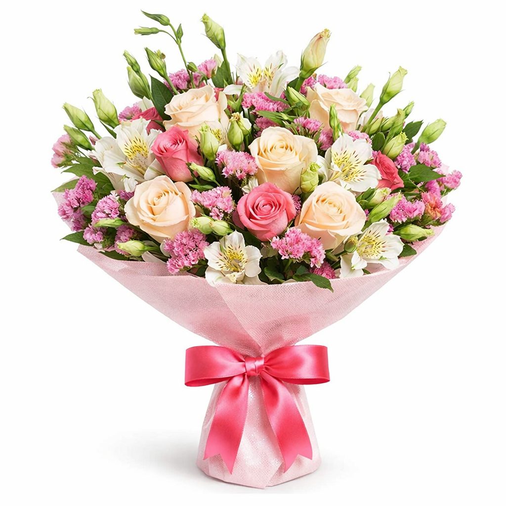 Нежная цветовая гамма розового лизиантуса, кремовой одноголовой розы, белой альстромерии и статицы создаёт гармоничную композицию. Букет упакован в матовую плёнку и перевязан атласной лентой, что придаёт ему изысканность. Композиция создаёт атмосферу утончённости и элегантности. Прекрасный выбор для подарка на день рождения для любимой или жены.