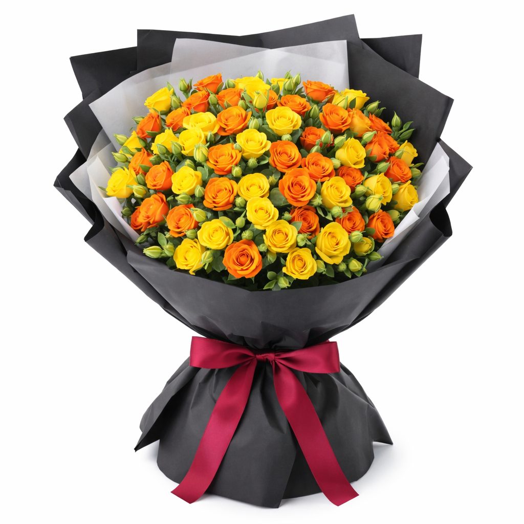 Этот букет вызывает ощущение тепла и солнечного дня благодаря ярким желтым и оранжевым кустовым розам. Упакован в элегантную черную матовую пленку, дополненную фиолетовой лентой. Композиция создаёт атмосферу радости и счастья. Идеально подойдет для поздравления любимой женщины на юбилей.