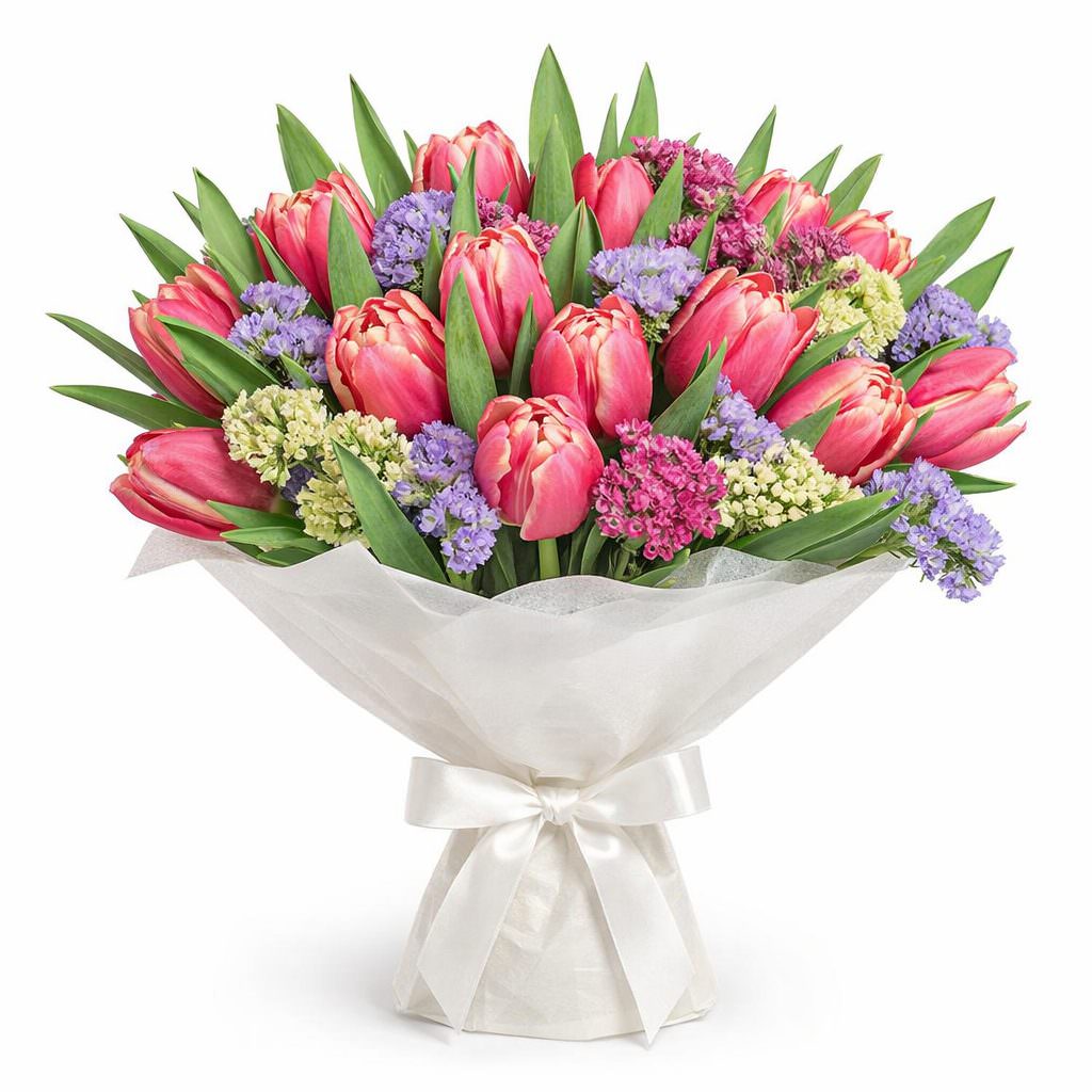 Яркие розовые пионовидные тюльпаны в сочетании с миксом статицы в жёлтых и сиреневых оттенках создают атмосферу весеннего праздника. Букет оформлен в матовую пленку с крафтом и украшен нежной лентой в горошек. Эта композиция дарит ощущение свежести и радости. Прекрасный подарок для любимого человека на день рождения или годовщину.