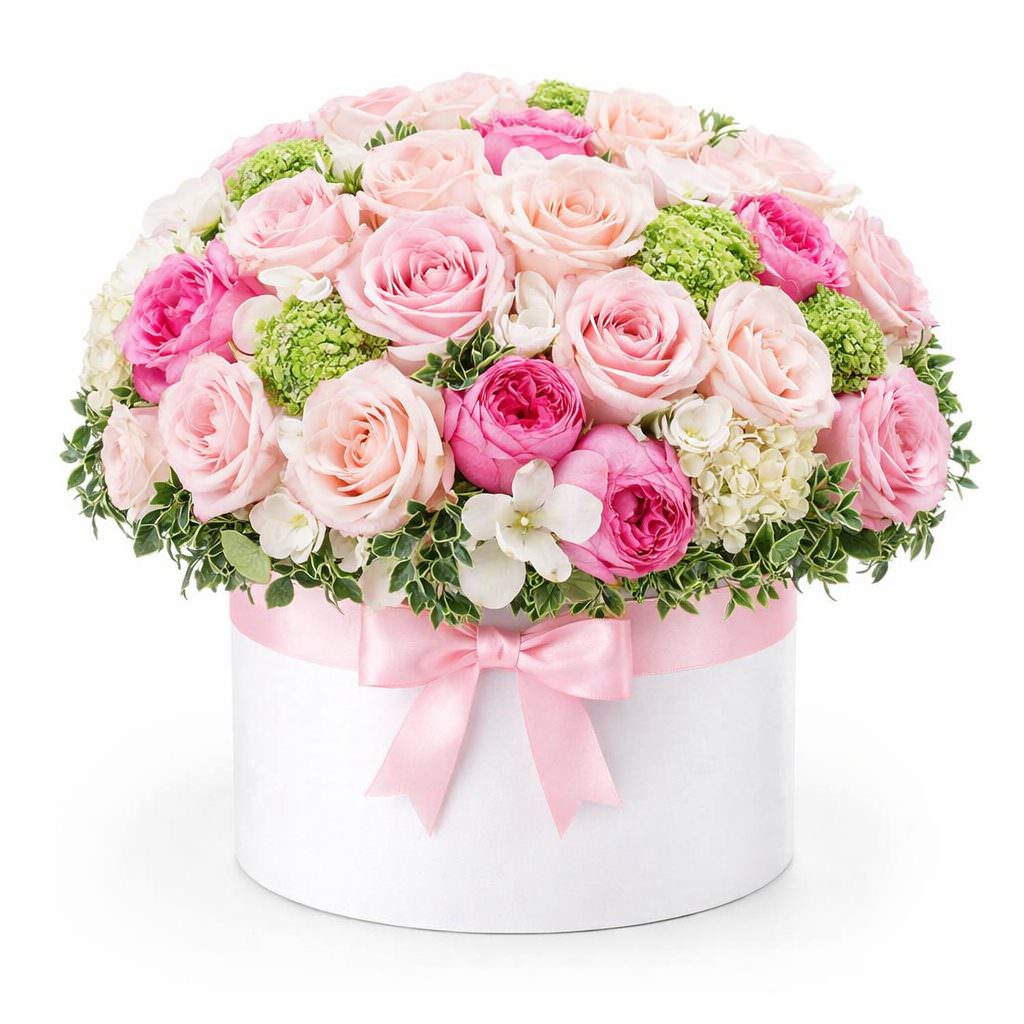 Нежная и изысканная композиция в пастельных тонах создаст атмосферу легкости и радости. В составе: кремовые и розовые розы, белая гортензия, белая орхидея, белая эустома, бересклет и зелень. Упакован в элегантную белую шляпную коробку, которая подчеркивает утонченность букета. Прекрасный подарок для любимой на годовщину.