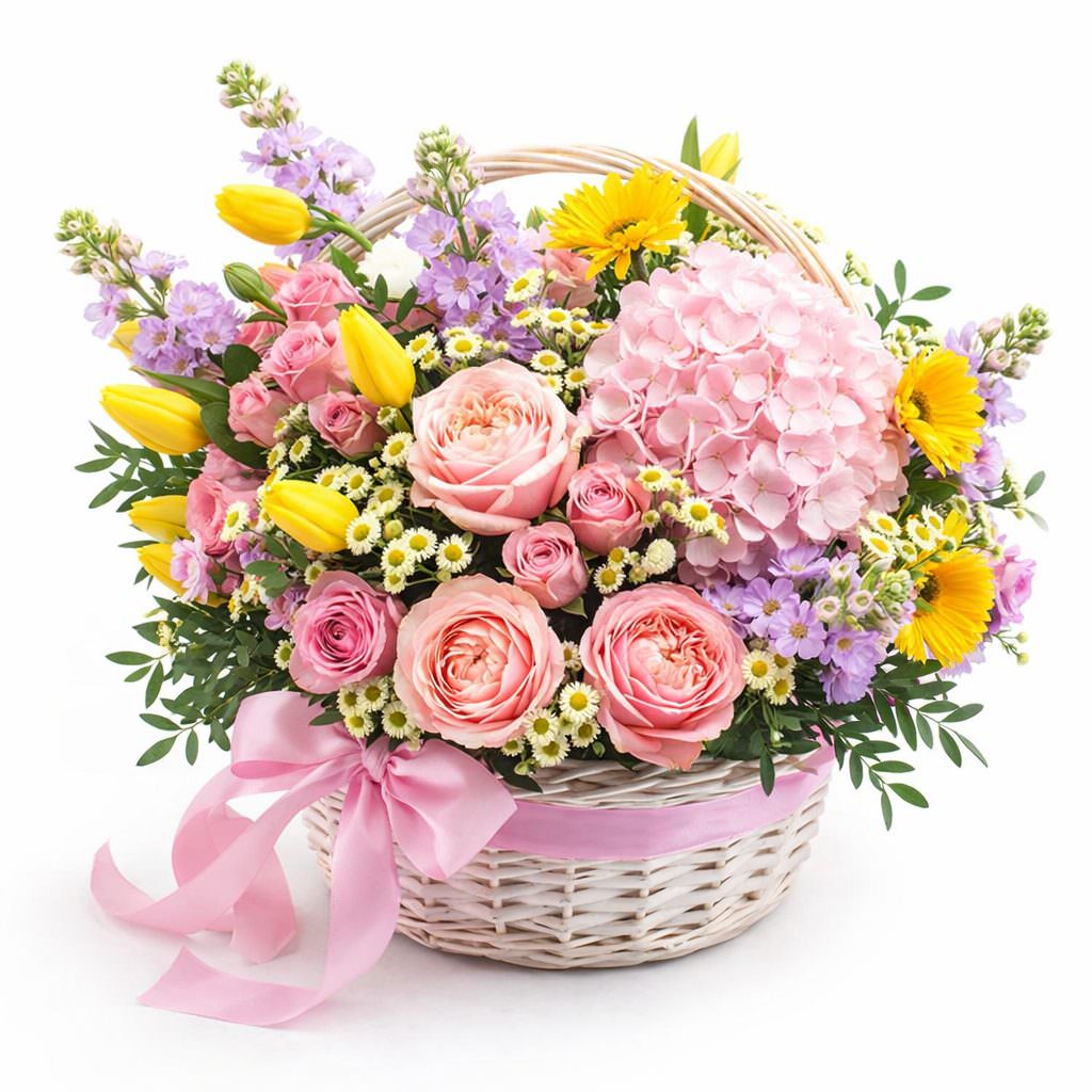 Эта цветочная композиция дарит ощущение яркой весенней радости благодаря сочетанию желтых гербер и тюльпанов, розовых и кустовых роз, а также сиреневой маттиолы. Корзина украшена розовой гортензией и дополнена нарциссами, танацетумом и ромашками, создавая атмосферу свежести и нежности. Плетёная корзина с лентой добавляет изысканности и шарма. Идеально подойдет для поздравления молодой мамы на День семьи, любви и верности.