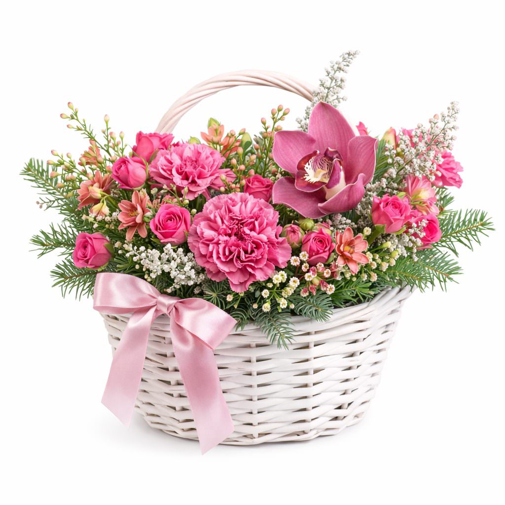 Яркость и нежность розовой гаммы создают атмосферу радости и тепла. В составе розовая орхидея, розовая гвоздика, розовая кустовая роза, розовая хризантема, ваксфлауэр и пихта. Композиция оформлена в белой плетёной корзине с двумя ручками. Идеально подойдёт для встречи из роддома, чтобы порадовать молодую маму.
