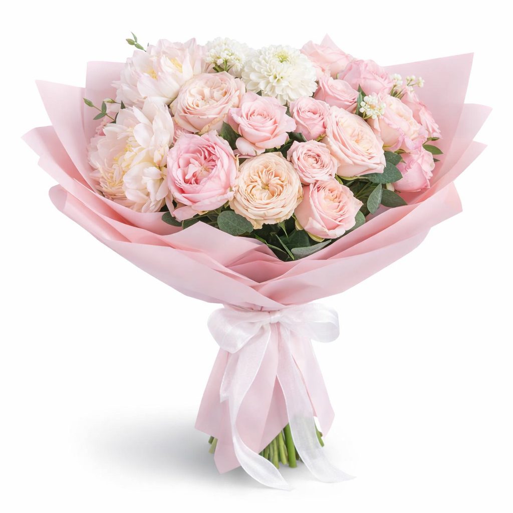 Нежная цветовая гамма розовых и белых оттенков вызывает чувство умиротворения. В составе букета пион белый, пионовидные розовые розы, белый георгин и эвкалипт. Упакован в матовую пленку розового цвета с аккуратной белой атласной лентой. Эта композиция создаёт атмосферу изысканности и элегантности. Идеально подойдёт для поздравления учительницы на День знаний.