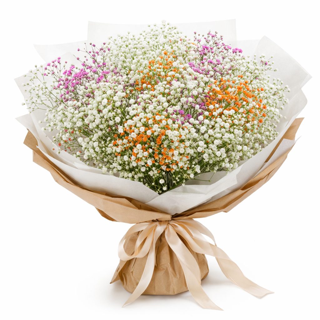 Эти яркие оттенки белой, оранжевой и розовой гипсофилы создают атмосферу радости и лёгкости. Букет собран из белой, оранжевой и розовой гипсофилы. Упакован в крафт-бумагу с белой матовой плёнкой и украшен атласной лентой. Композиция вносит тепло и уют в любое пространство. Прекрасно подойдёт для поздравления молодой мамы на День матери.