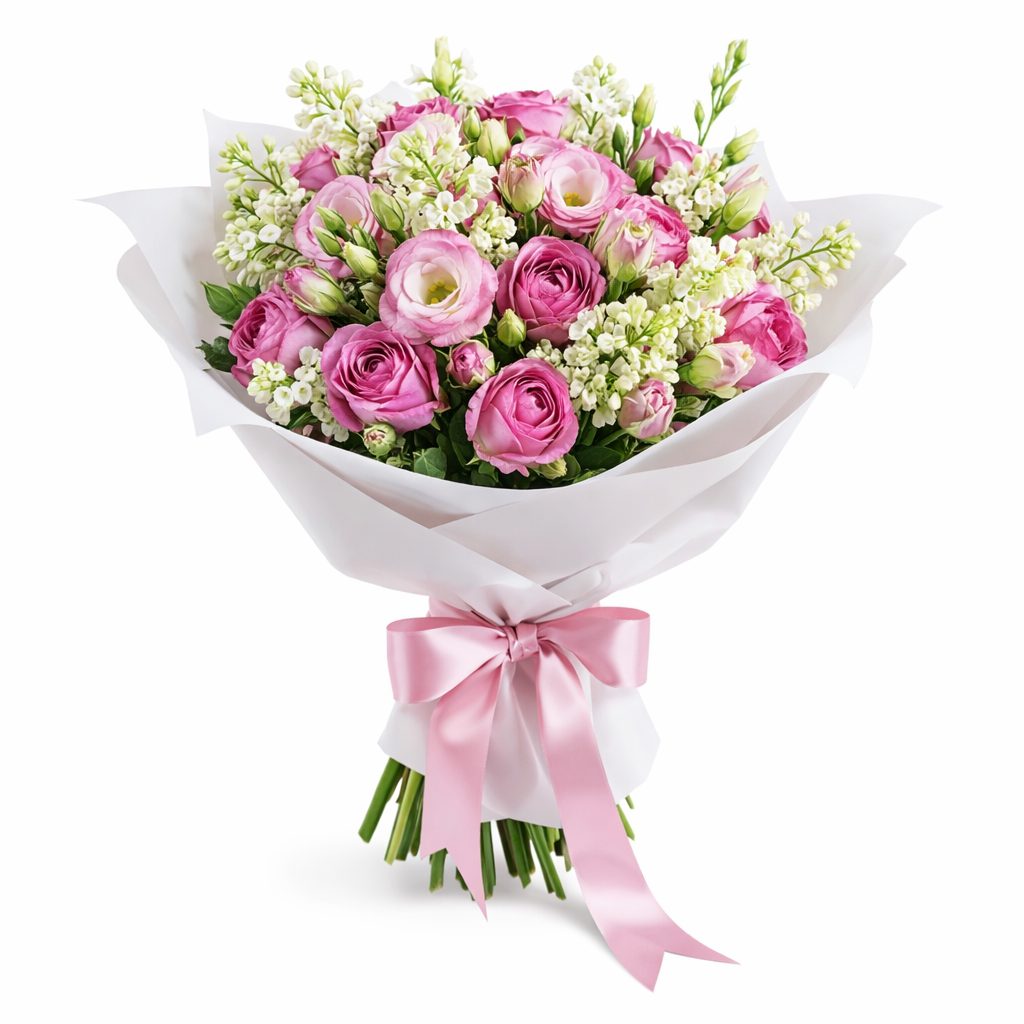 Элегантный букет в розово-белой гамме создаёт атмосферу нежности и романтики. В его составе розовая эустома, белая маттиола, белая сирень и розовая кустовая роза бомбастик. Букет оформлен в белую матовую плёнку и перевязан розовой атласной лентой. Эта композиция станет прекрасным подарком для жены на годовщину.