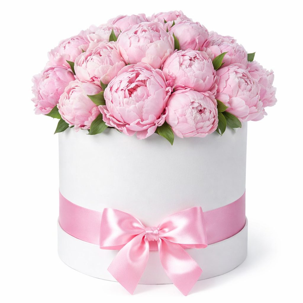 Шляпная коробка с пионами «Волшебные лепестки» с гарантией качества, цены и быстрой доставки!