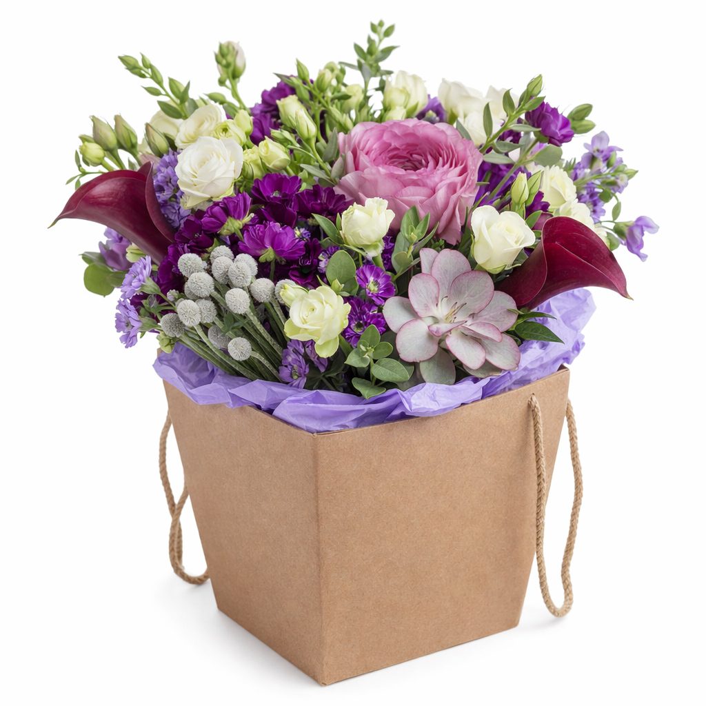 Эта композиция завораживает сочетанием пастельных и ярких оттенков, создавая атмосферу нежности и утончённости. В составе декоративная капуста, бордовая калла, белая эустома, сиреневая маттиола, суккулент, бруния и сиреневая статица, дополняемые зеленью. Упакована в элегантную коробку с ручками, подчёркивающую изысканный стиль. Подойдет для романтического вечера для любимой женщины.
