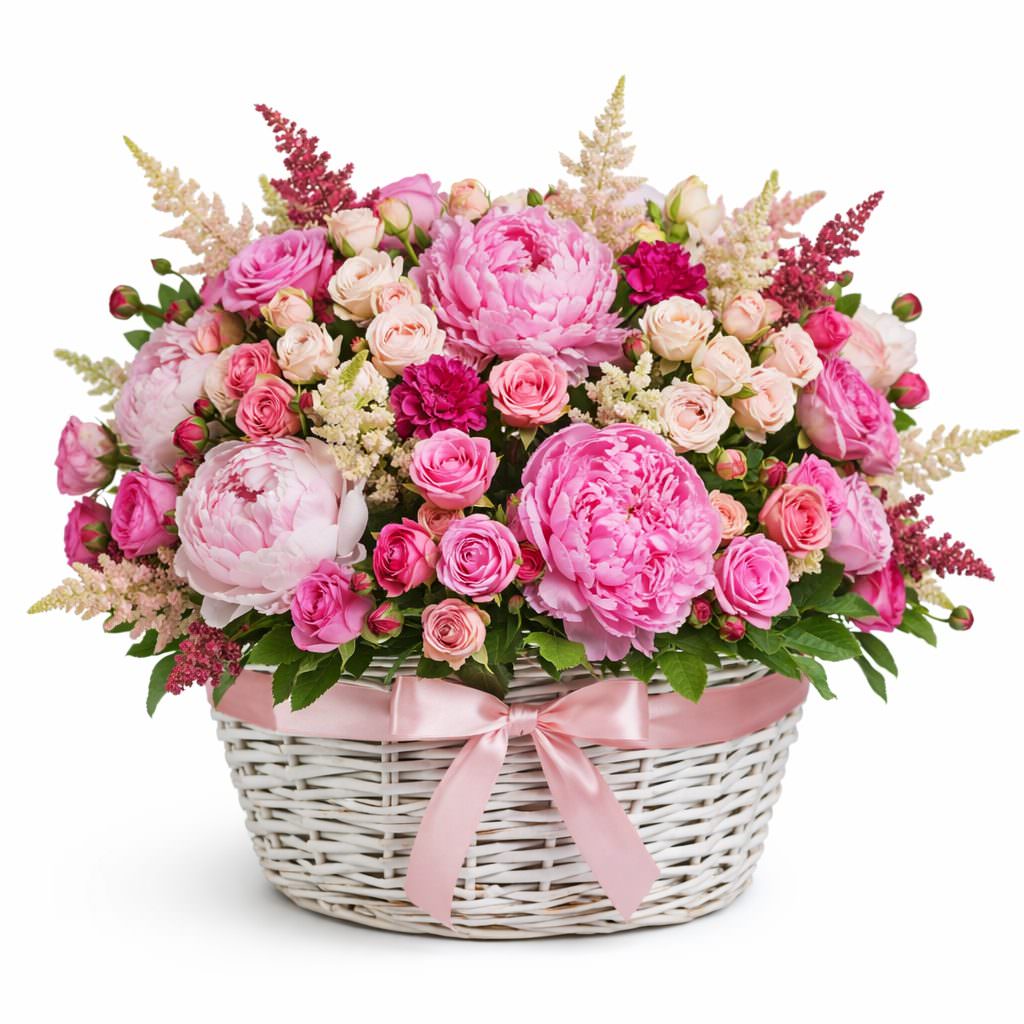 Эта композиция из розовых и кремовых оттенков дарит нежность и изящество. Состав включает кустовую розу микс, пион розовый, астильбу и розовую эустому. Плетёная корзина белого цвета добавляет элегантности и утончённости. Композиция создаёт атмосферу романтики и идеально подойдёт для подарка на юбилей для любимой женщины.
