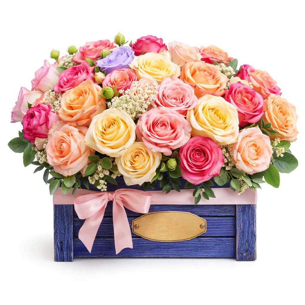 Эта яркая композиция в розово-кремовых тонах наполнена одноголовыми розами разных цветов, розовой эустомой, гипсофилой и эвкалиптом. Все цветы аккуратно размещены в ящике с оазисом, который добавляет изысканность и шарм. Композиция создаёт атмосферу радости и уюта, идеально подходящая для благодарности врачу. Подарок для любимой женщины, который выразит ваши самые тёплые чувства.