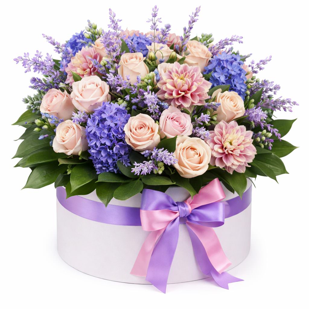 Эта композиция дарит ощущение лёгкости и романтики с нежными розовыми и кремовыми оттенками. В букете собраны синие гиацинты, кремовые кустовые розы, розовые диантусы и кремовые одноголовые розы, дополненные свежей зеленью. Упакован в стильную шляпную коробку, украшенную яркой фиолетовой и розовой лентами. Создаёт атмосферу волшебства, идеально подойдёт для благодарности врачу. Порадует любого получателя.